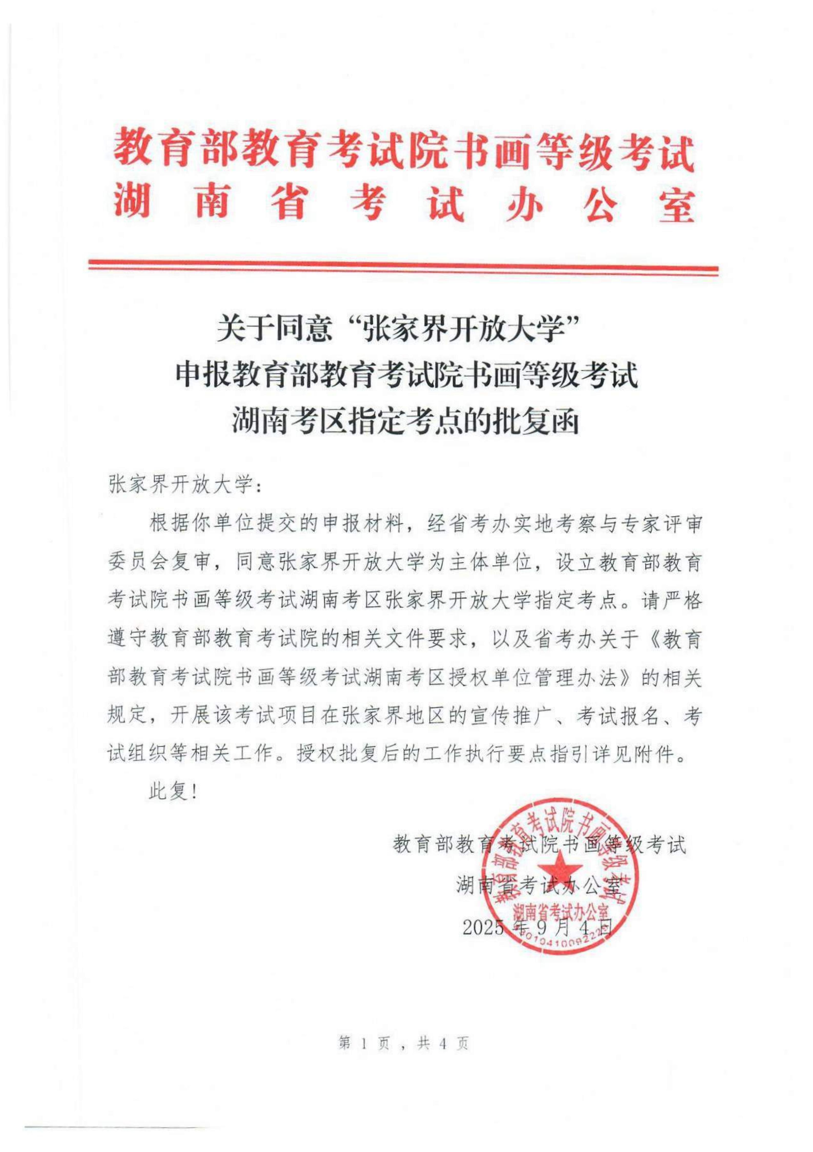关于同意“张家界开放大学”申报教育部教育考试院书画等级考试湖南考区指定考点的批复函